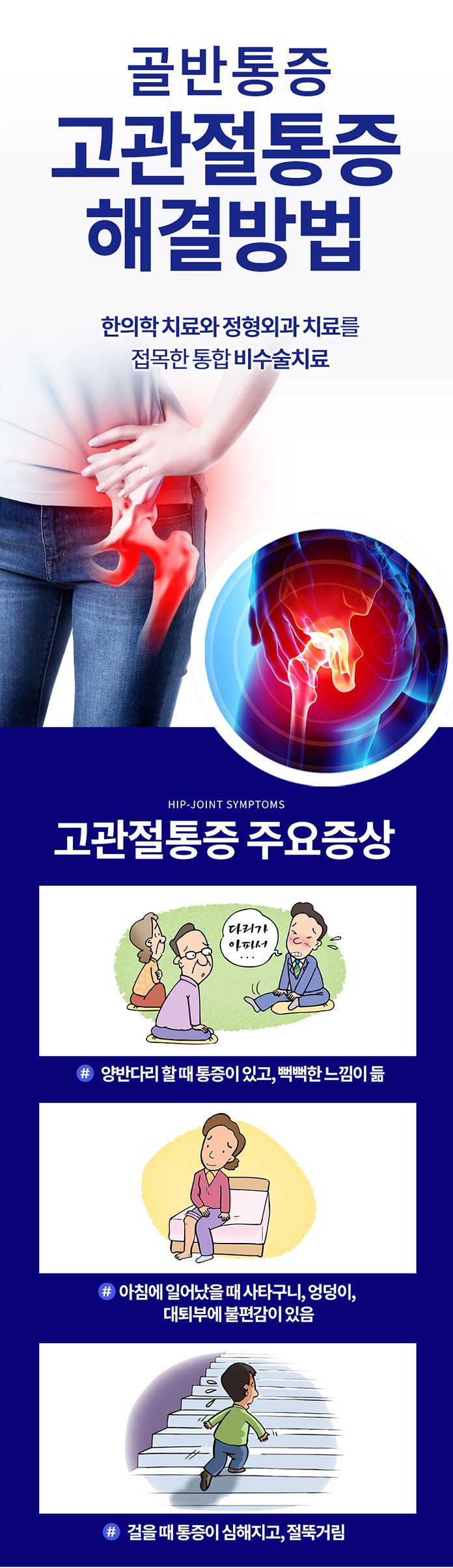 - 둔탁한 통증: 고관절 내부나 주변에서 지속적으로 느껴지는 둔탁한 통증은 가장 흔한 증상입니다. 이는 자주 활동을 하거나 무리를 한 경우 발생할 수 있습니다.