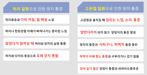 - 앉을 때 통증: 바닥에 앉거나 의자에서 일어설 때 통증이 느껴져 일상적인 행동이 어려울 수 있습니다.