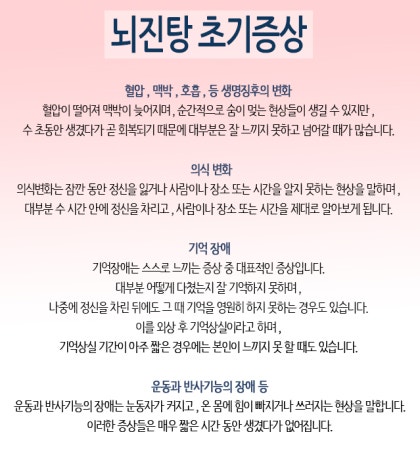 - 신경세포 손상: 외부의 충격이 가해지면, 뇌의 신경세포들이 손상을 입게 되며, 이는 통증이나 혼란과 같은 초기 증상을 유발할 수 있습니다.