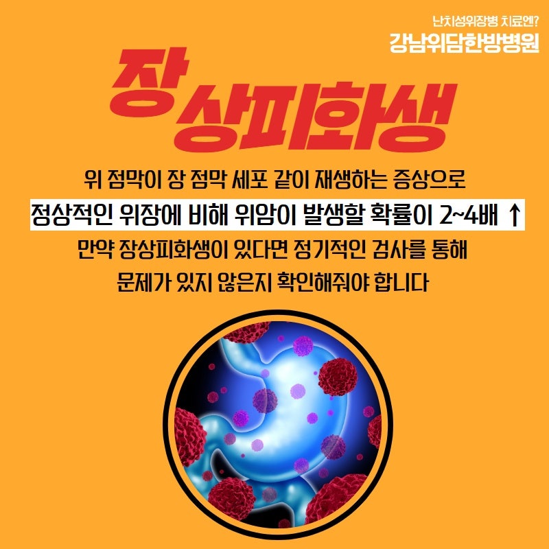 - 염증 반응의 역할: 위의 염증은 위 점막 세포의 사멸을 유발하고, 그 자리를 새로운 세포가 채우도록 유도합니다. 이 과정에서 장상피화생이 진행됩니다.