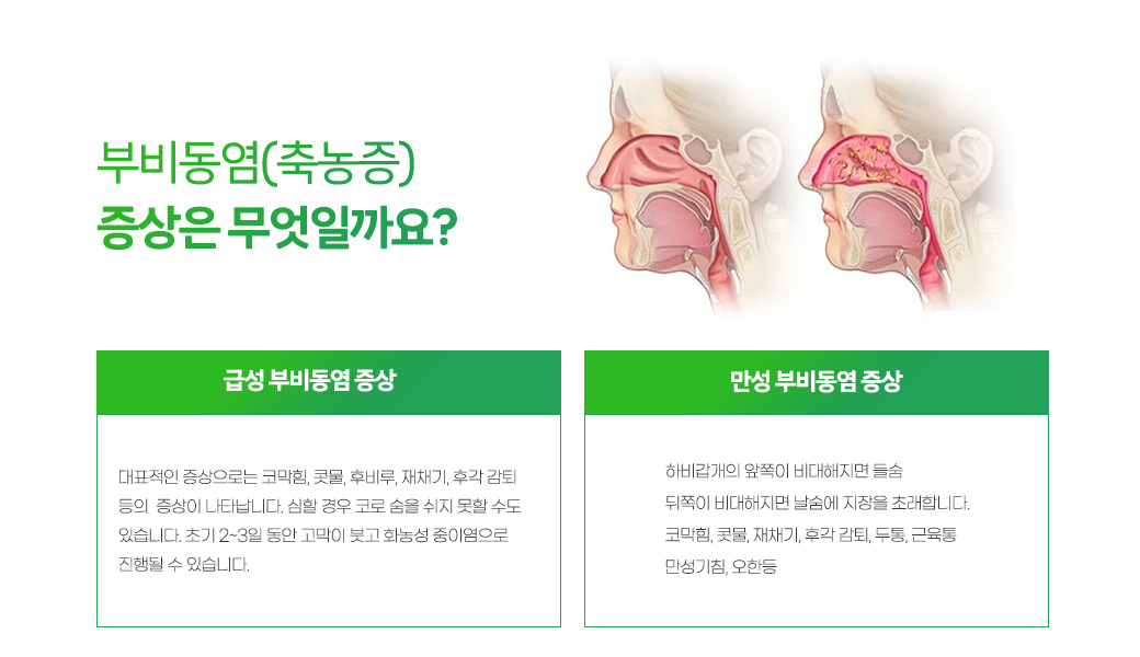 축농증, 또는 부비동염은 부비동(또는 축농)의 염증으로 특징지어지는 질환입니다. 이러한 염증은 다양한 원인에 의해 발생할 수 있으며, 일반적으로 감염, 알레르기, 또는 구조적 문제에 의해 유발됩니다. 축농증의 주요 증상으로는 코막힘, 두통, 얼굴 압박감, 미각이나 후각의 저하 등이 있습니다. 이러한 증상은 사람마다 다르게 나타날 수 있으며, 지속적인 관리가 필요할 수 있습니다. 특히, 축농증이 만성화될 경우 증상이 더욱 악화되고 일상생활에 지장을 줄 수 있습니다.