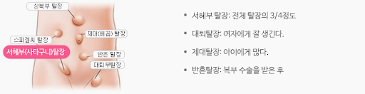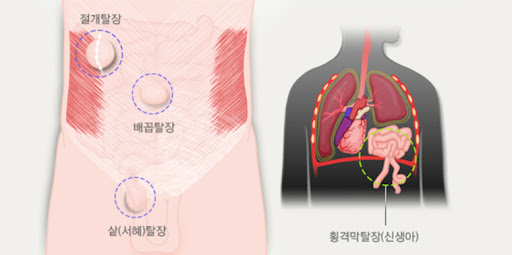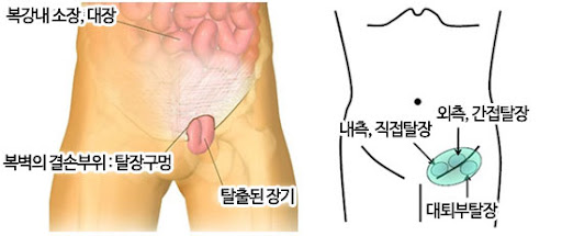 탈장은 위치에 따라 세 가지 주요 유형으로 나뉩니다.