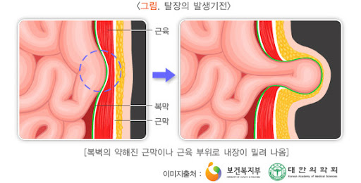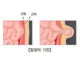 탈장이 발생할 때, 일반적으로 다음과 같은 메커니즘이 있습니다. 외부 압력과 내부 압력이 비정상적으로 조화를 이루지 못할 경우, 그 결과로 복벽의 약한 부분이 늘어나고 이로 인해 장기가 외부로 밀려나게 됩니다.