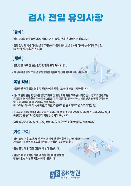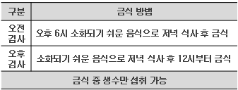 - 가벼운 저녁 식사: 검사 전날 가벼운 저녁을 통해 금식 시간을 더욱 수월하게 지킬 수 있습니다.