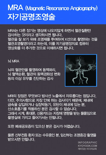 반면에 MRA(자기 공명 혈관 영상)는 MRI의 일종으로, 혈관의 이미지를 생성하는 데 초점을 맞추고 있습니다. 이는 혈관의 구조 및 흐름을 평가하는 데 유용하며, 주로 심혈관 질환의 진단에 사용됩니다. MRA는 특히 혈관의 협착이나 막힘, 동맥류와 같은 혈관 관련 문제를 발견하는 데 매우 유용합니다.