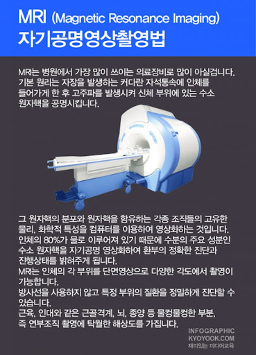 MRI(자기 공명 영상)은 강력한 자기장과 라디오파를 이용하여 체내 조직의 이미지를 생성하는 기술입니다. MRI는 연부 조직, 즉 뇌, spinal cord, 근육, 그리고 다양한 내장 장기 등을 상세하게 볼 수 있는 특징이 있습니다. 주로 신경계, 근골격계 및 종양 연구의 진단 도구로 사용됩니다.